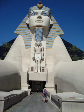 “Las Vegas, je houdt ervan óf je maakt dat je zo snel mogelijk weer weg bent. Wij behoren tot de laatste categorie. De allereerste keer in de VS hebben we er wel anderhalve dag doorgebracht en ons verbaasd over hoe alles hier ‘over the top’ is. We keken onze ogen uit bij al die themahotels. Venetië, Parijs, een Egyptische Pyramide (Luxor, foto), het is er allemaal. Wij namen een ‘gewoon’ hotel, Hotel Trump (!). Nou, noem het maar gewoon: gouden kranen en vanuit de jacuzzi konden we tv kijken want er zat een beeldscherm ín de spiegel.”